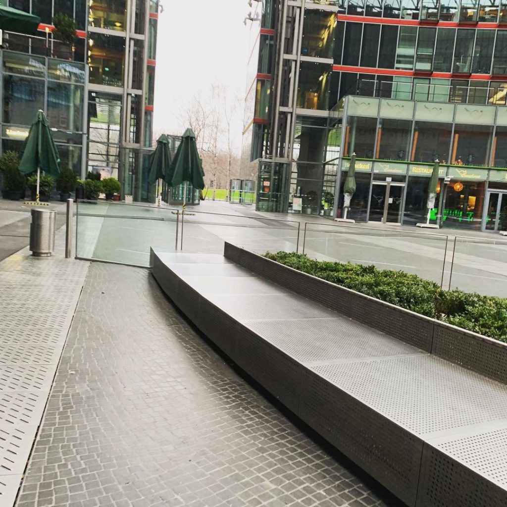 Metal ledges with poor ground, gap off bench over glass, rail over floor gap